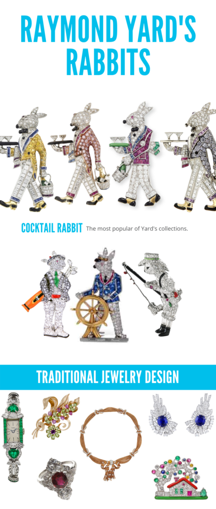 In the 1920’s Yard birthed one of his most distinctive designs; realistic and whimsical rabbit characters using exquisite gems. The rabbits all embodied different personas including rabbit brides, rabbit sailors and rabbit fisherman. The most famous is the Cocktail Rabbit, holding a tray of martinis. It is easy to say that Yard’s pieces are very recognizable. The rabbit brooches still occasionally make it into auctions or private sales.
